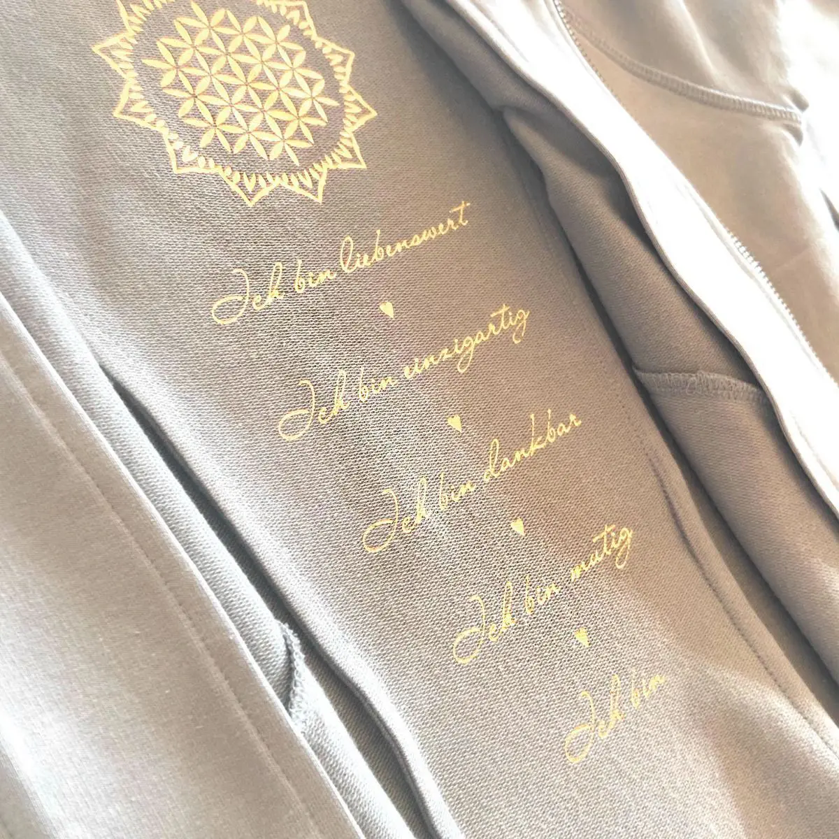 Im Innendruck findest du die wundervolle und stärkende Affirmation: Ich bin liebenswert – Ich bin einzigartig – Ich bin dankbar – Ich bin mutig – Ich bin. Diese Affirmation soll dich im Alltag positiv unterstützen und dir dabei helfen noch wertschätzender mit deiner Kleidung umzugehen. Indem du dich bei jedem Tragen mit der Affirmation verbindest, machst du dir die Besonderheit des Kleidungsstücks bewusst und kommst so in ein noch schöneres Wohlgefühl und in eine tiefere Wertschätzung.