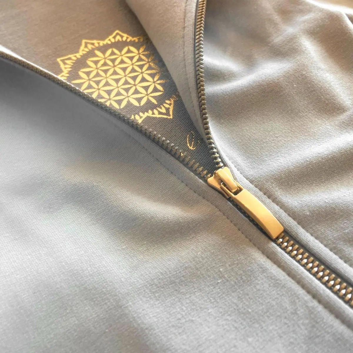 Durch den goldenen Zipper kann die Jacke auch offen getragen werden. Die praktischen Kängurutaschen verleihen ihr einen lässigen Look, während der schlichte, hohe Kragen für die nötige Eleganz sorgt.