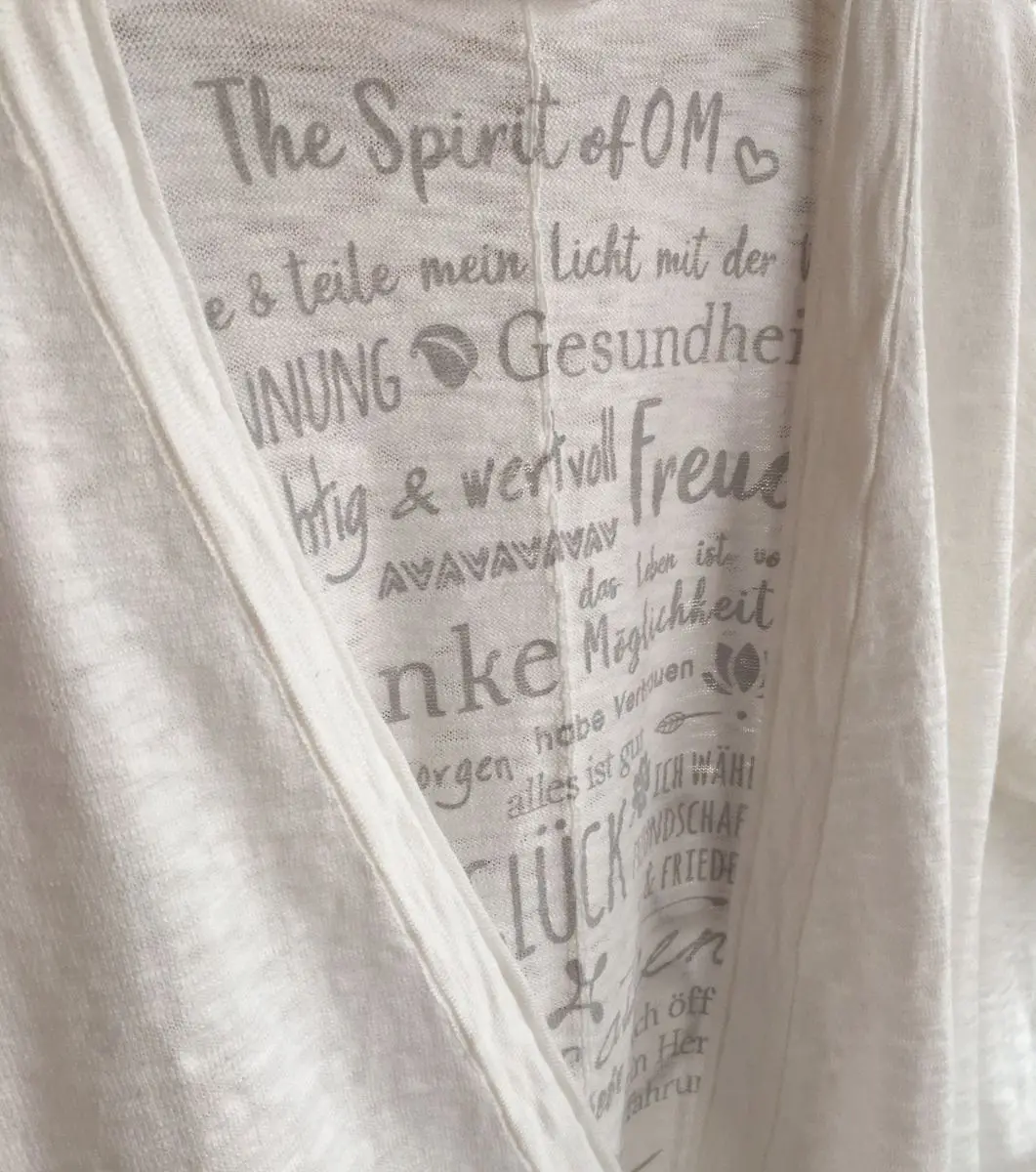 Ganz besonders einzigartig an diesem neuen Lieblingsstück sind ihre positiven Affirmationen im Innendruck. Ein Großteil des Rückens ist innenseitig mit vielen stärkenden Affirmationen bedruckt, die die Trägerin dieser Jacke positiv unterstützen. In Nacken wurde liebevoll ein kleiner Feder-Anhänger angebracht.