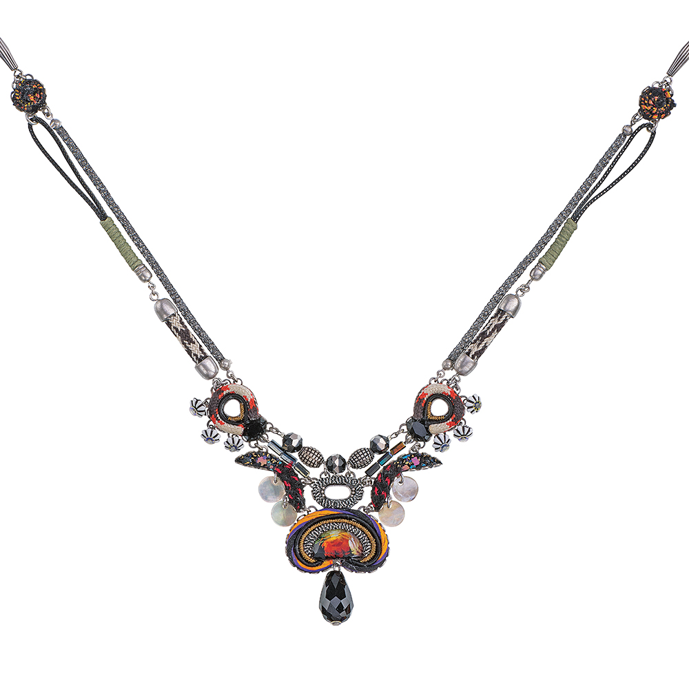 Collier aus versilbertem Messing, Glas, Kristall, Textil aus der Hip 05 Collection, Classic green